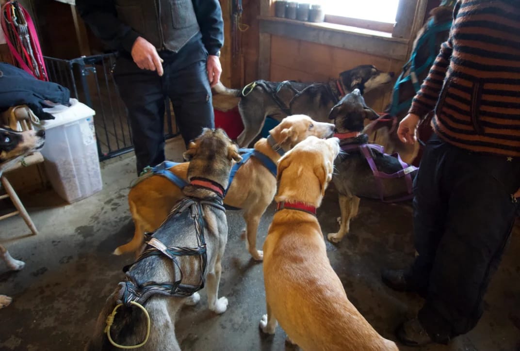 Our guide Rodney took over and showed us how to put the dogs' specialized harnesses on. He also made sure to let us know that the lean dogs were indeed well-fed and cared for. Apparently many guests were not accustomed to seeing dogs with such athletic physiques and often expressed concern. I assured him that I was well aware that these dogs were the picture of health. I would later learn that their diets consisted of a high-quality kibble (purchased by the pallet) along with raw chicken carcasses and daily supplementation of coconut oil, probiotics and gelatin. As the team drew closer to being ready, the dogs' growing excitement was palpable. They lined up near the door and whined for us slow humans to hurry up.